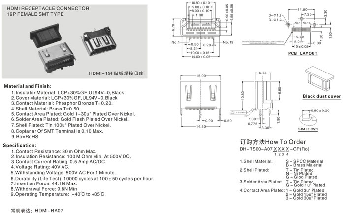 HDMI-19F 贴板焊接母座 HDMI RECEPTACLE CONNECTOR19P FEMALE SMT TYPE