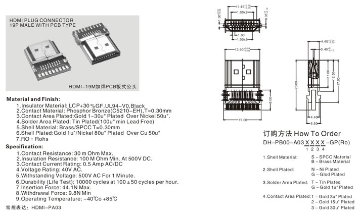 HDMI-19M加焊PBC版式公头 HDMI PLUG CONNECTOR19P AMLE WITH PCB TYPE