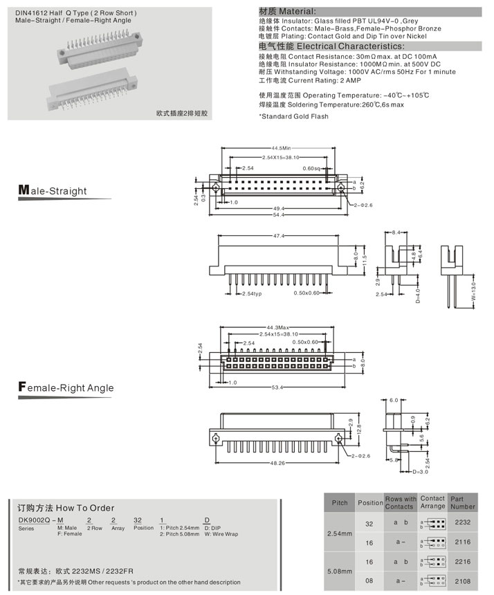 欧式插座2排短胶 DIN41612 Q Type(2 Row Short) Male-Right Angle/Female-Stright)