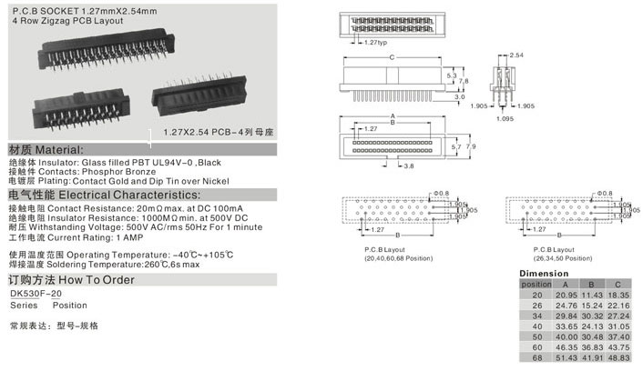1.27*2.54PCB-4列母座 P.C.B SOCKET 1.27mm*2.54mm 4 Row Zigzag PCB Layout