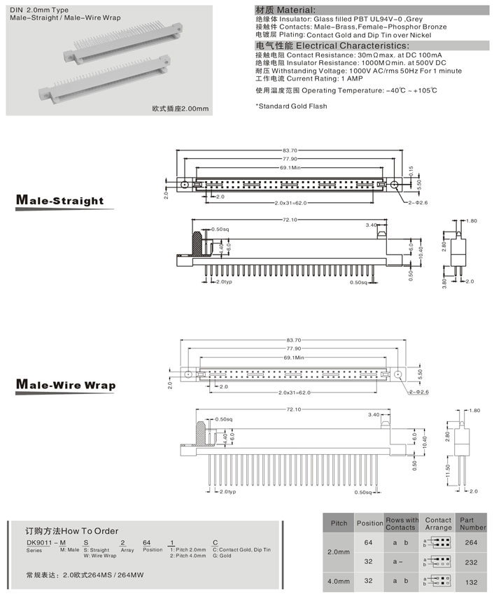 欧式插座2.00mm DIN2.0mm Type Male-straight/Male-Wire Wrap