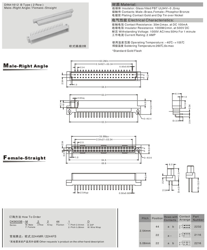 欧式插座2排 ( 2 Rom )Male-Right Angle/Female-Straight