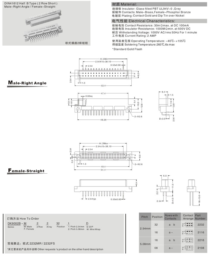 欧式插座2排短胶DIN41612 Half B Type (2 Rom short )Male-Right Angle/ Female-Straight