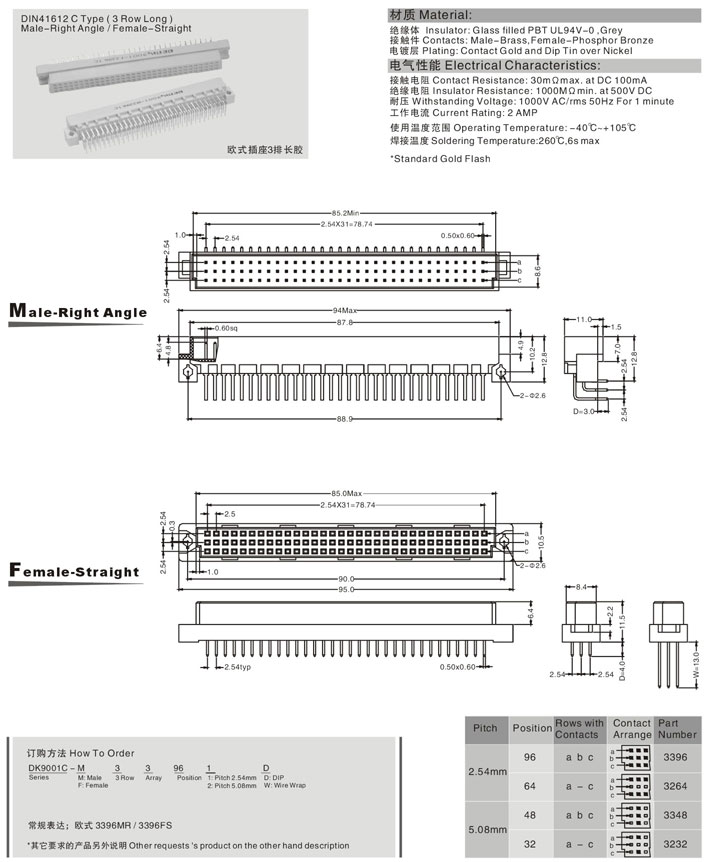 欧式插座3排长胶(3 Row Long) Male-Stright/Female-Right-Angle