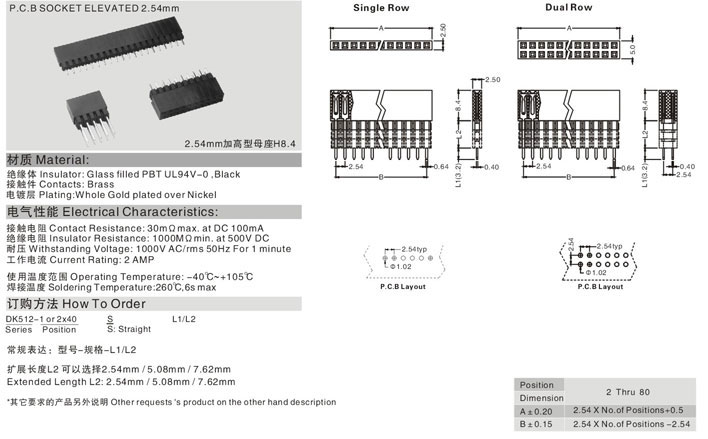 2.54mm加高型母座H8.4 P.B.C SOCKET ELEVATED 2.54mm
