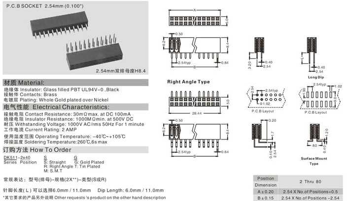 2.54mm双排母座H8.4 P.C.B SOCKET 2.54 mm(0.100)