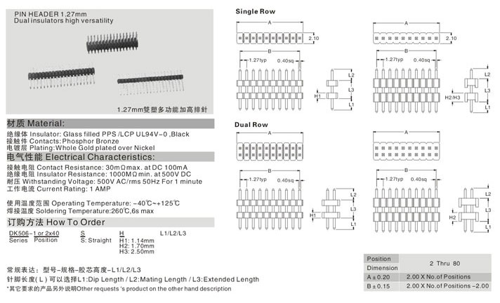 1.27mm双塑多功能加高排针 PIN HEADER1.27mm Dual insulators high versatility