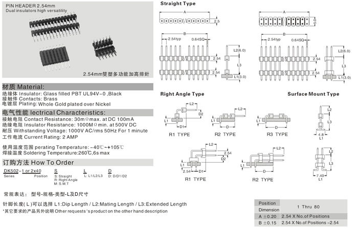 2.54mm双塑多功能加高排针 PIN HEADER 2.54mm (Doul Row)